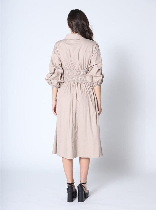 Ruched Puff Sleeve & Waist A Line Midi Dress